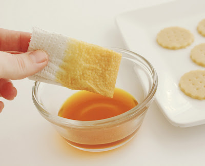 Fold it up and use it to paint the food coloring on the tops of the cookies. Get enough on there that it actually changes the color of the cookie, but make sure you don't leave any puddles. (That sounded kind of weird when I wrote that, but I actually can't think of another way to say it. Don't think any less of me.)