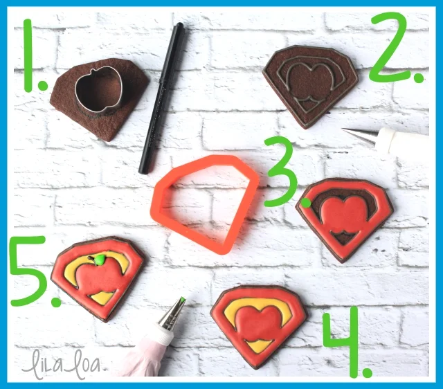 1. Use a food color marker to trace a mini apple cutter in the center of the super hero cookie.